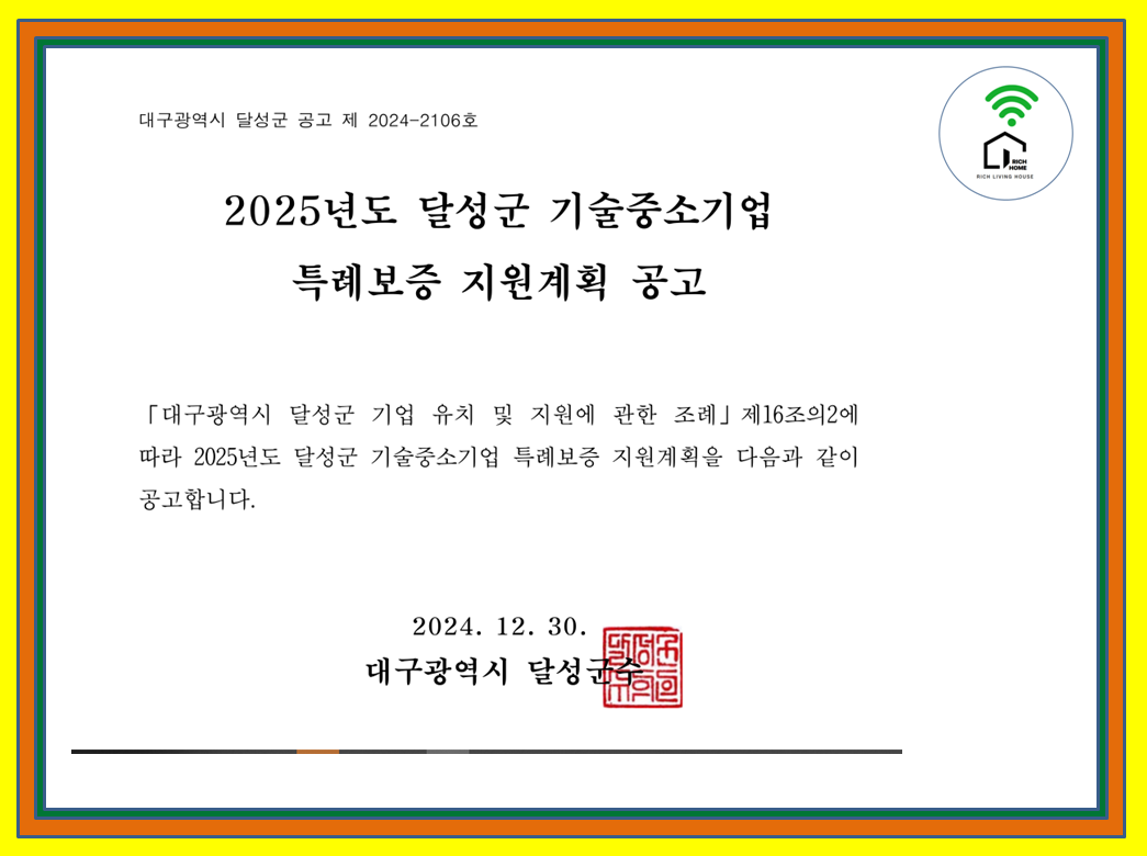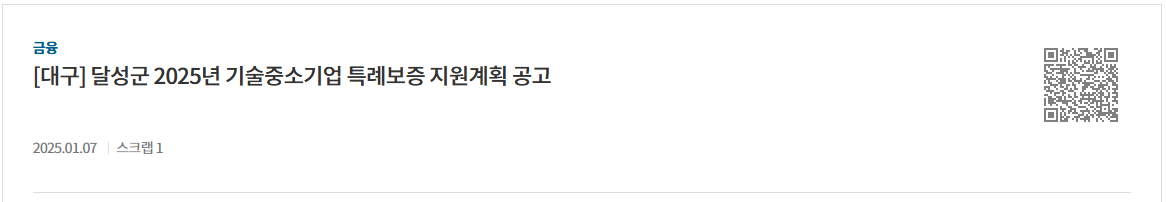 「대구광역시 달성군 기업 유치 및 지원에 관한 조례」제16조의2에 따라 2025년도 달성군 기술중소기업 특례보증 지원계획을 다음과 같이 공고합니다.