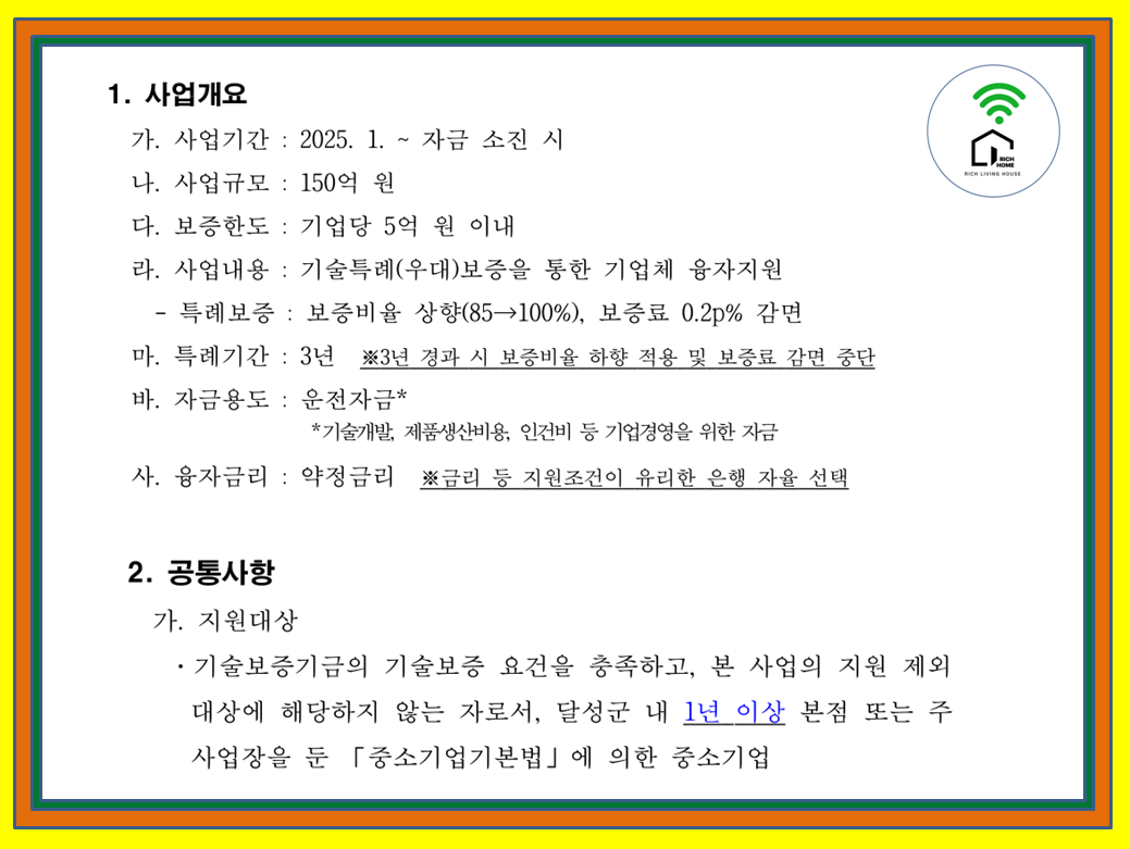 - 특례보증 : 기술보증 100%, 보증료 0.2p% 감면 / 특례기간 : 최대 3년 / 보증한도 : 기업당 최대 5억 원