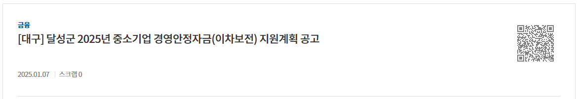 「대구광역시 달성군 중소기업 경영안정자금 이차보전금 지원에 관한 조례」제4조에 따라 2025년도 달성군 중소기업 경영안정자금(이차보전) 지원계획을 다음과 같이 공고합니다.
