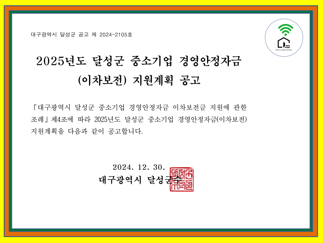 | 금융[대구] 달성군 2025년 기술중소기업 특례보증 지원계획 공고 (0) | 2025.01.09 |