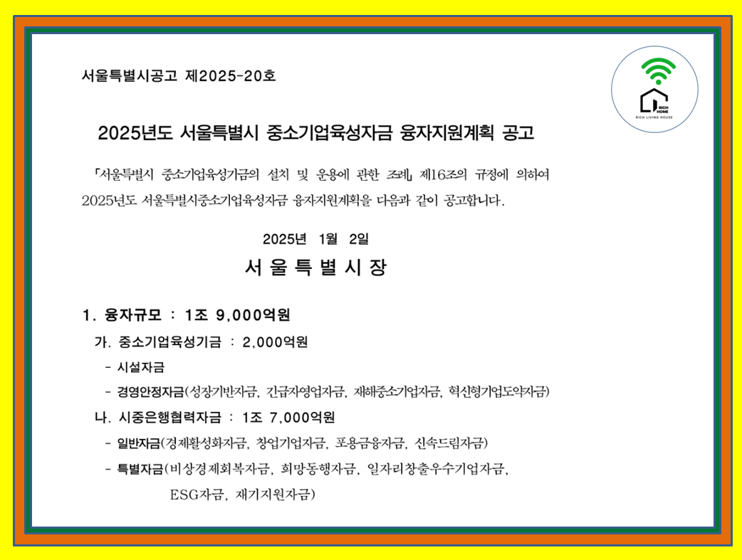 「서울특별시 중소기업육성기금의 설치 및 운용에 관한 조례」제16조의 규정에 의하여 2025년도 서울특별시중소기업육성자금 융자지원계획을 다음과 같이 공고합니다.