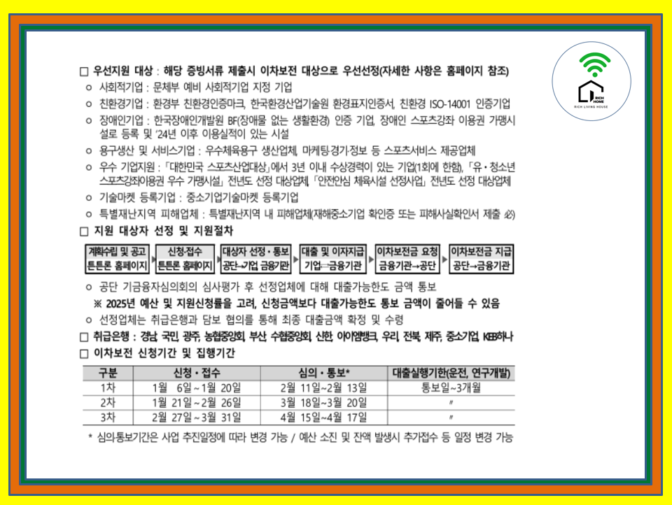 - 국민체육진흥기금 스포츠산업 이차보전사업은 사업자별 시중 대출금리 중 2.5%p 금리를 공단에서 지원