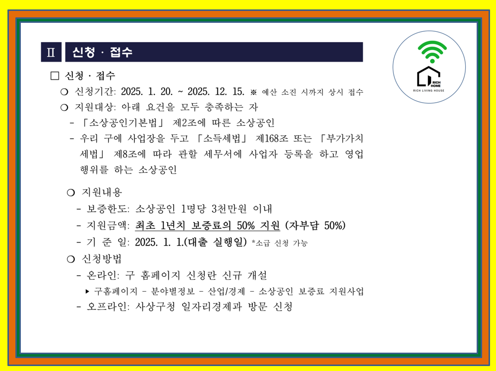 「부산광역시 사상구 소상공인 지원에 관한 조례」 제6조(창업 및 경영 안정 지원), 제7조(특례보증 또는 보증료 지원)에 따라 「2025년 소상공인 보증료 지원사업」대상자를 다음과 같이 모집하오니 많은 참여 바랍니다.