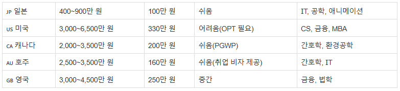 나라학비(연간)생활비(월)졸업 후 취업인기 전공